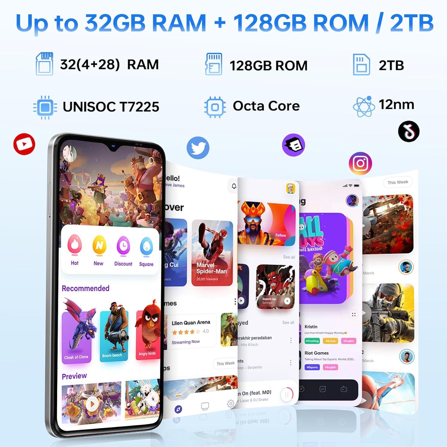 Das DOOGEE NOTE 56 X PRO verfügt über 32 GB RAM (4 GB Basisspeicher + bis zu 28 GB erweiterter Speicher) und 128 GB ROM, was einen Massenspeicher bietet, um mehrere Aufgaben gleichzeitig auszuführen und Fotos und Dokumente einfach zu speichern. Es unterstützt zwei SIM-Karten, darunter SIM1+SIM2 oder SIM-Karte + TF-Karte, und ermöglicht eine externe Speicherkapazität von bis zu 2 TB.