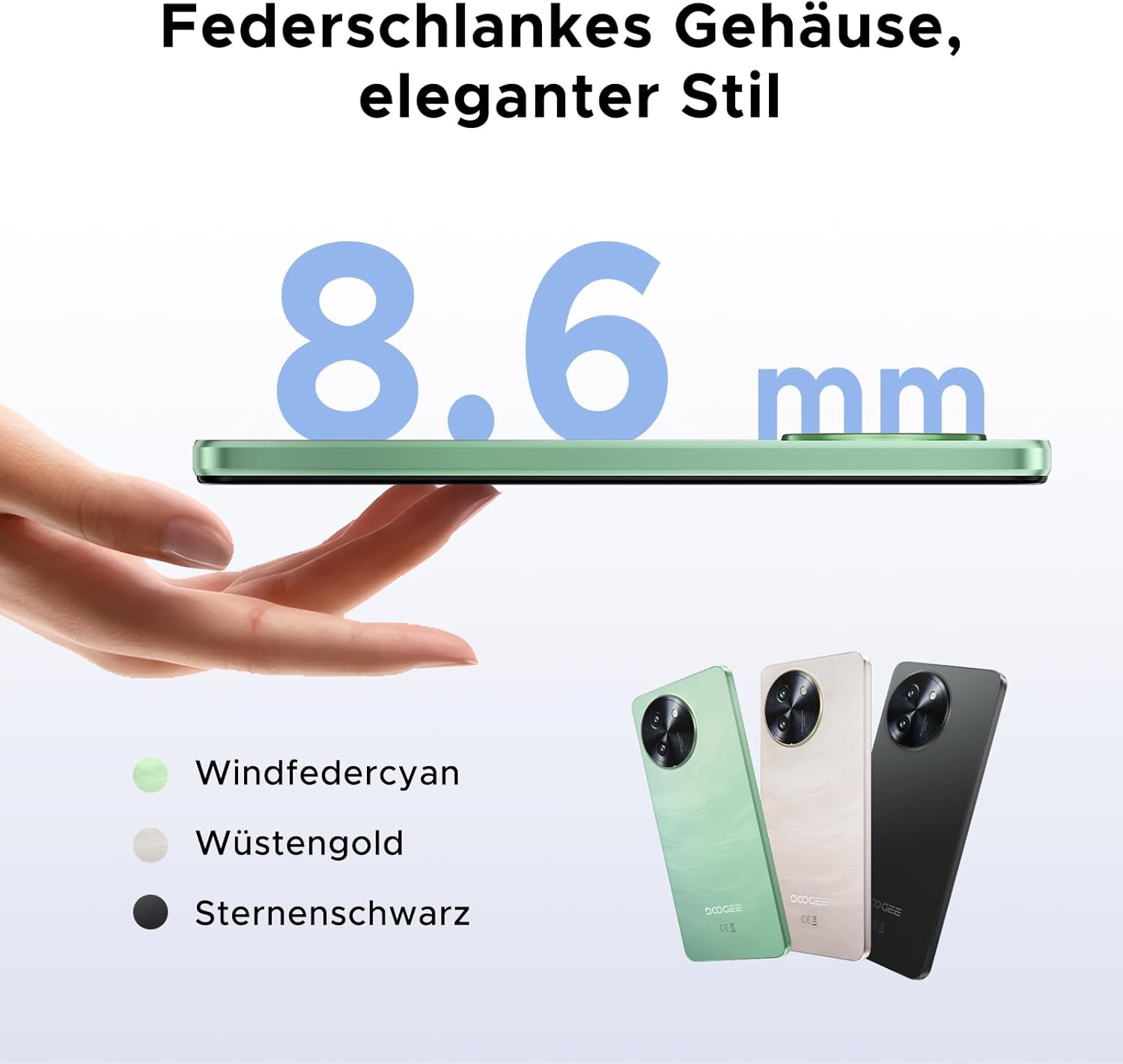Das Smartphone verfügt über einen 6250mAh-Akku, der für lange Nutzungsdauer sorgt. Mit nur einer einzigen Ladung können Sie stundenlang im Internet surfen, Videos ansehen, Spiele spielen und wichtige Anrufe tätigen. Das ultradünne 8,6mm-Gehäuse und das schlank-komakte Design des DOOGEE Note 59 Pro 5G machen es zu einem perfekten Begleiter für den täglichen Gebrauch.