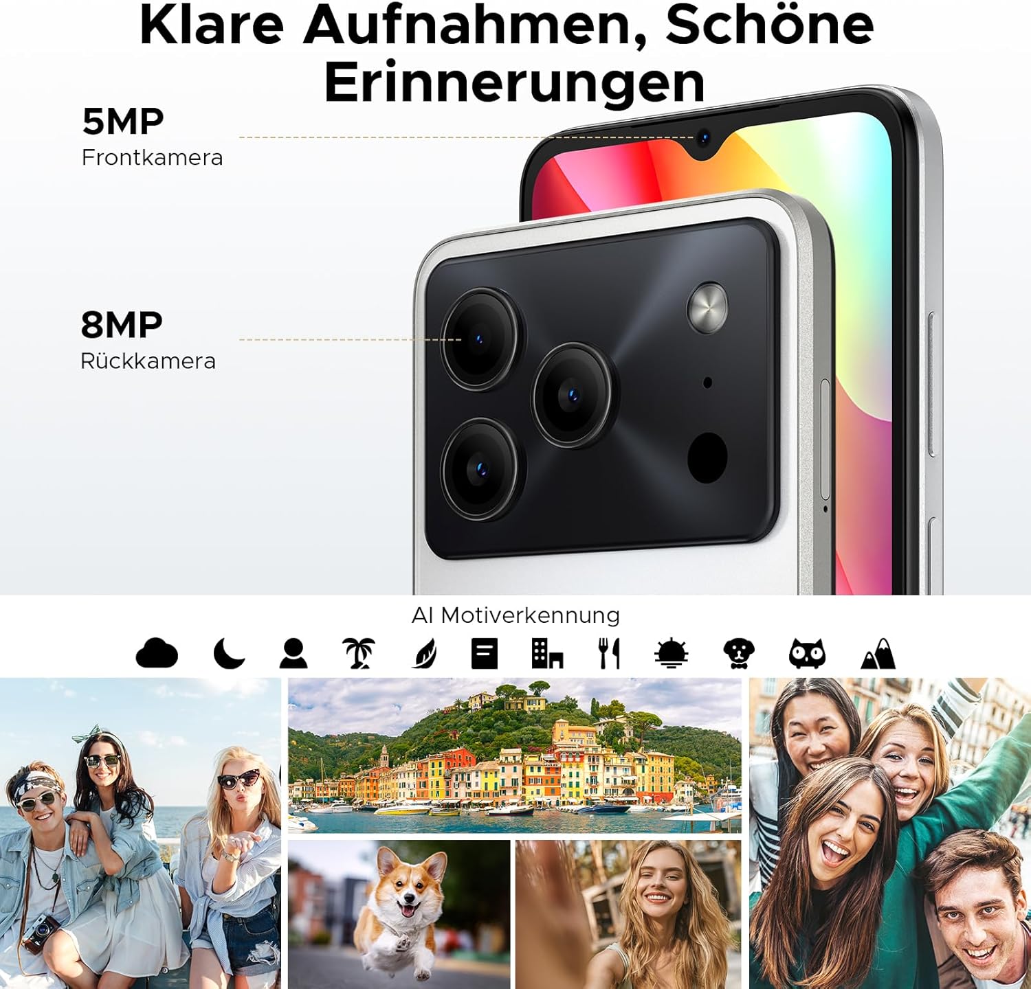 Das DOOGEE Note 56 verfügt über eine 8MP Hauptkamera und eine 5MP Frontkamera, die klare Fotos für den täglichen Bedarf aufnehmen. Die Kamera-App bietet verschiedene Modi und Einstellungen, um die beste Qualität aus Ihren Fotos herauszuholen.