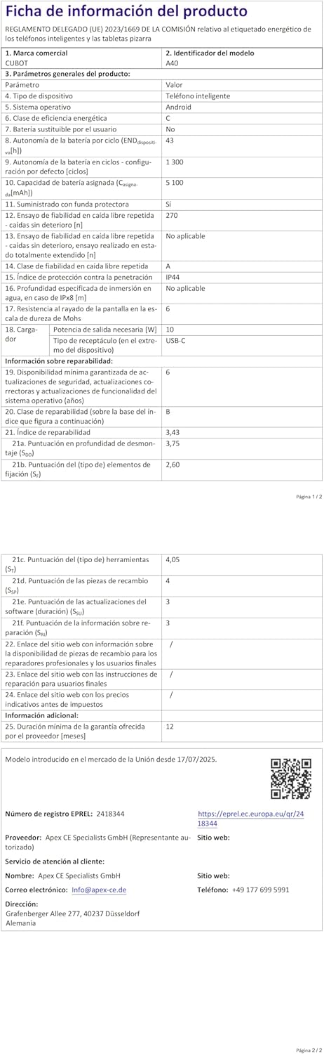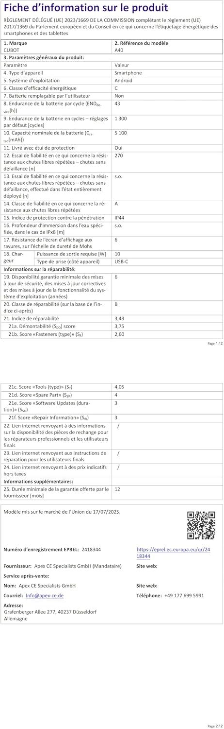 Insgesamt ist das CUBOT A40 (2025) ein leistungsstarkes Android 15 Smartphone, das eine Vielzahl von Funktionen und Spezifikationen bietet, um den Bedürfnissen moderner Nutzer gerecht zu werden. Mit seinem hochauflösenden Display, schnellem Prozessor, großen Speicher und langen Akku ist es ein ideales Gerät für Nutzer, die ein Hochleistungs-Smartphone suchen.