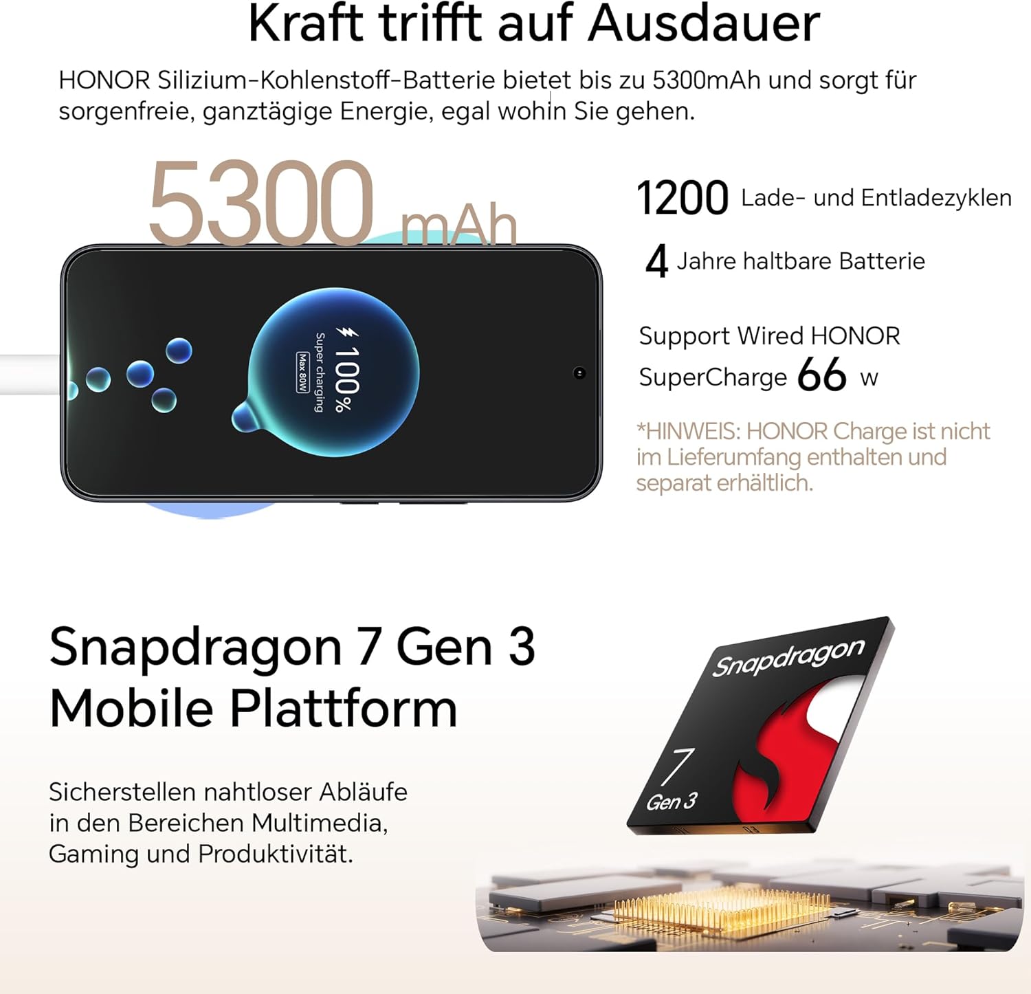 Das HONOR 400 Smartphone 5G verfügt über einen leistungsstarken Snapdragon 7 Gen 3-Chip, der flüssiges Multitasking und Gaming ermöglicht. Der 5300mAh-Akku hält auch bei intensiver Nutzung durch und unterstützt 66W SuperCharge für schnelles Laden. Die Silizium-Kohlenstoff-Technologie garantiert 80% Kapazität nach 4 Jahren (1200 Zyklen), was bedeutet, dass der Akku auch nach langem Gebrauch noch immer leistungsfähig bleibt.