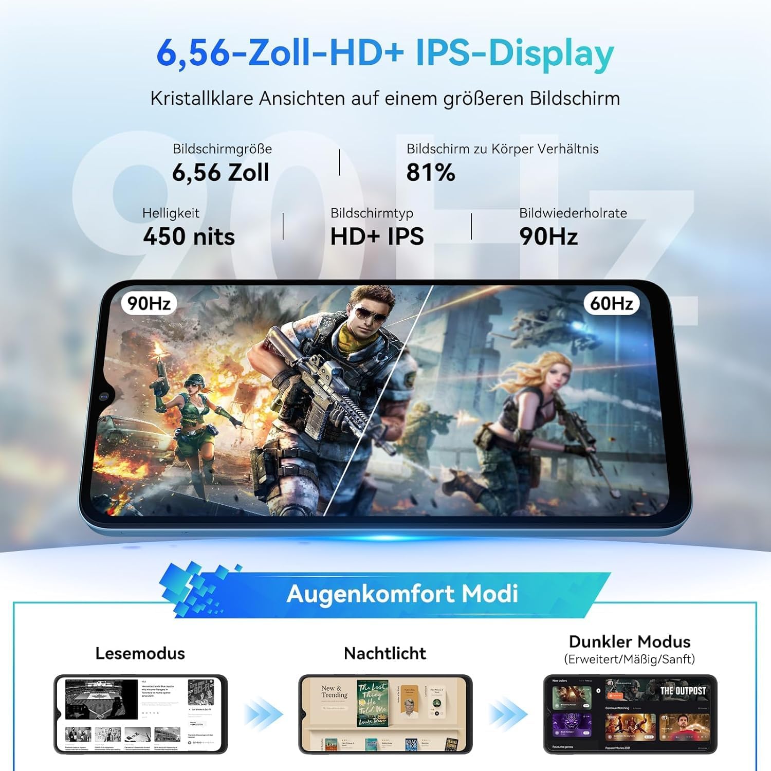 Blackview 2025 Handy Ohne vertrag, 12GB+256GB/2TB TF, 90Hz 6.56″, 5000mAh Smartphone Günstig, Octa Core, 13MP+8MP, Dual SIM/Fingerabdruck/GPS/OTG/Handytasche/Härtungsfolie
