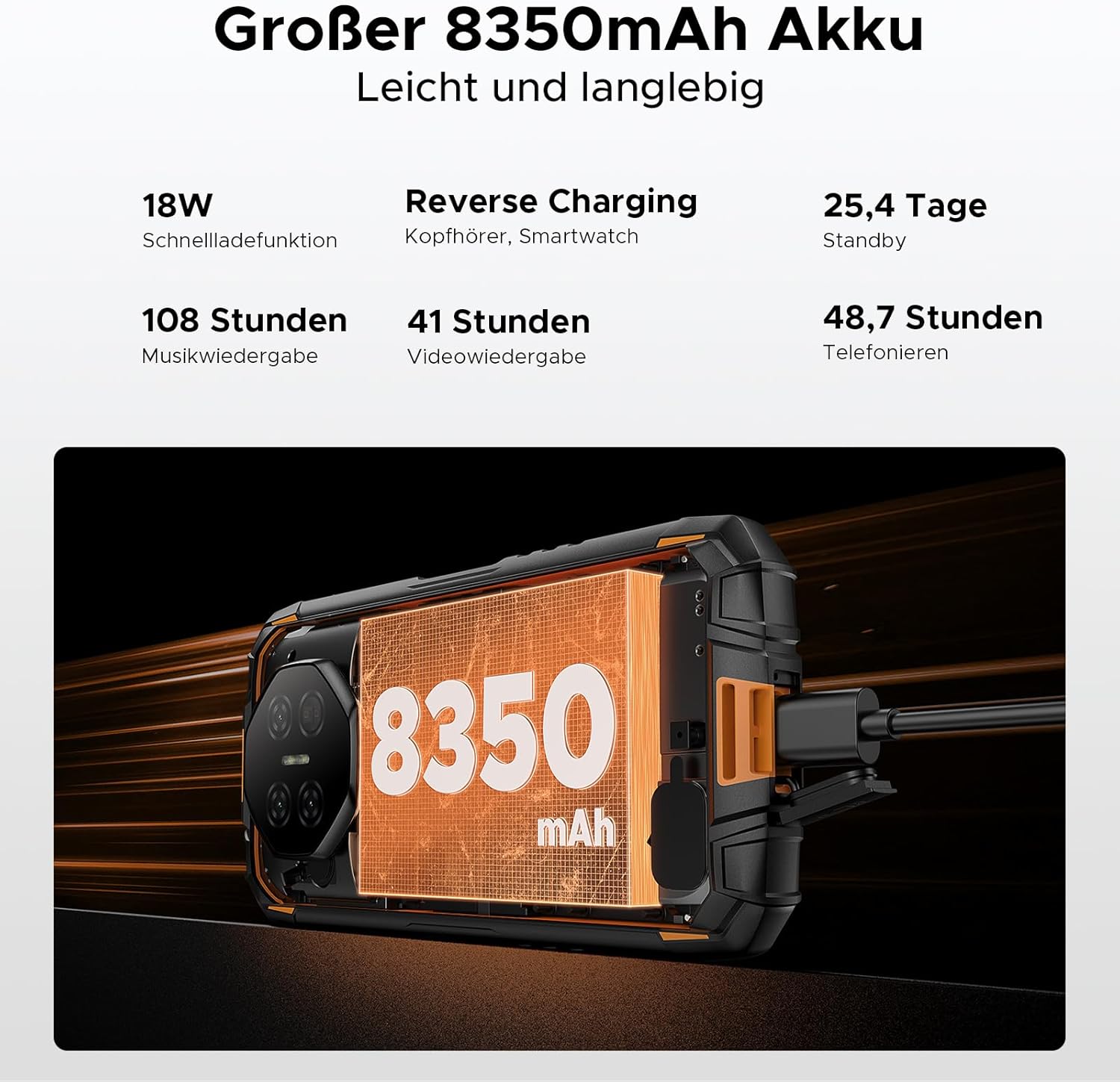 Das DOOGEE Fire 3 Ultra ist mit einem großen 8350-mAh-Akku ausgestattet, der eine lange Akkulaufzeit bietet und den Anforderungen des täglichen Lebens gerecht wird. Es verfügt außerdem über eine 18-W-Schnellladefunktion für schnelles Laden. Die OTG-Reverse-Charging-Funktion ermöglicht es, das Gerät als Backup-Stromversorgung für andere Geräte zu verwenden.